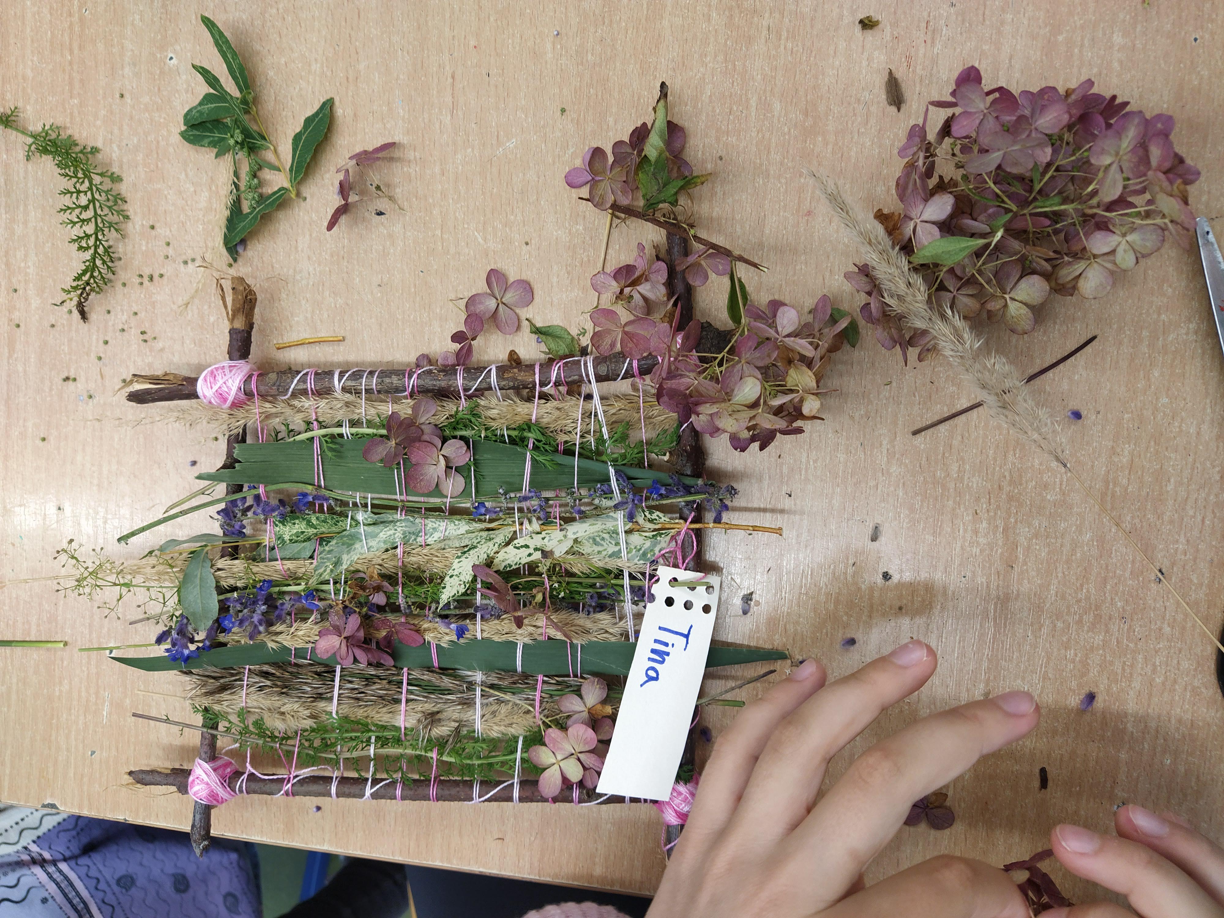 4x tkaní na dřívkách přibližně A4, 6x keramické plošné objekty A6 připevněné na dřívkách, odkaz na YouTube