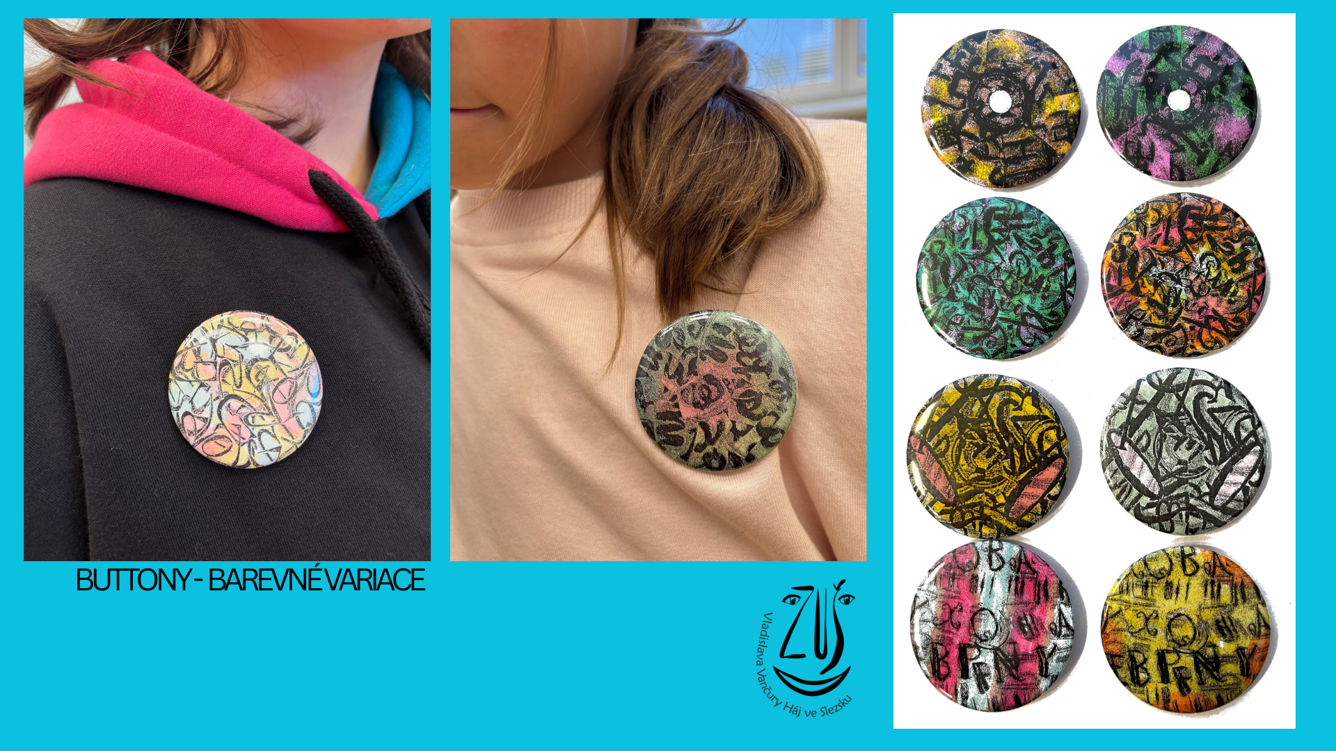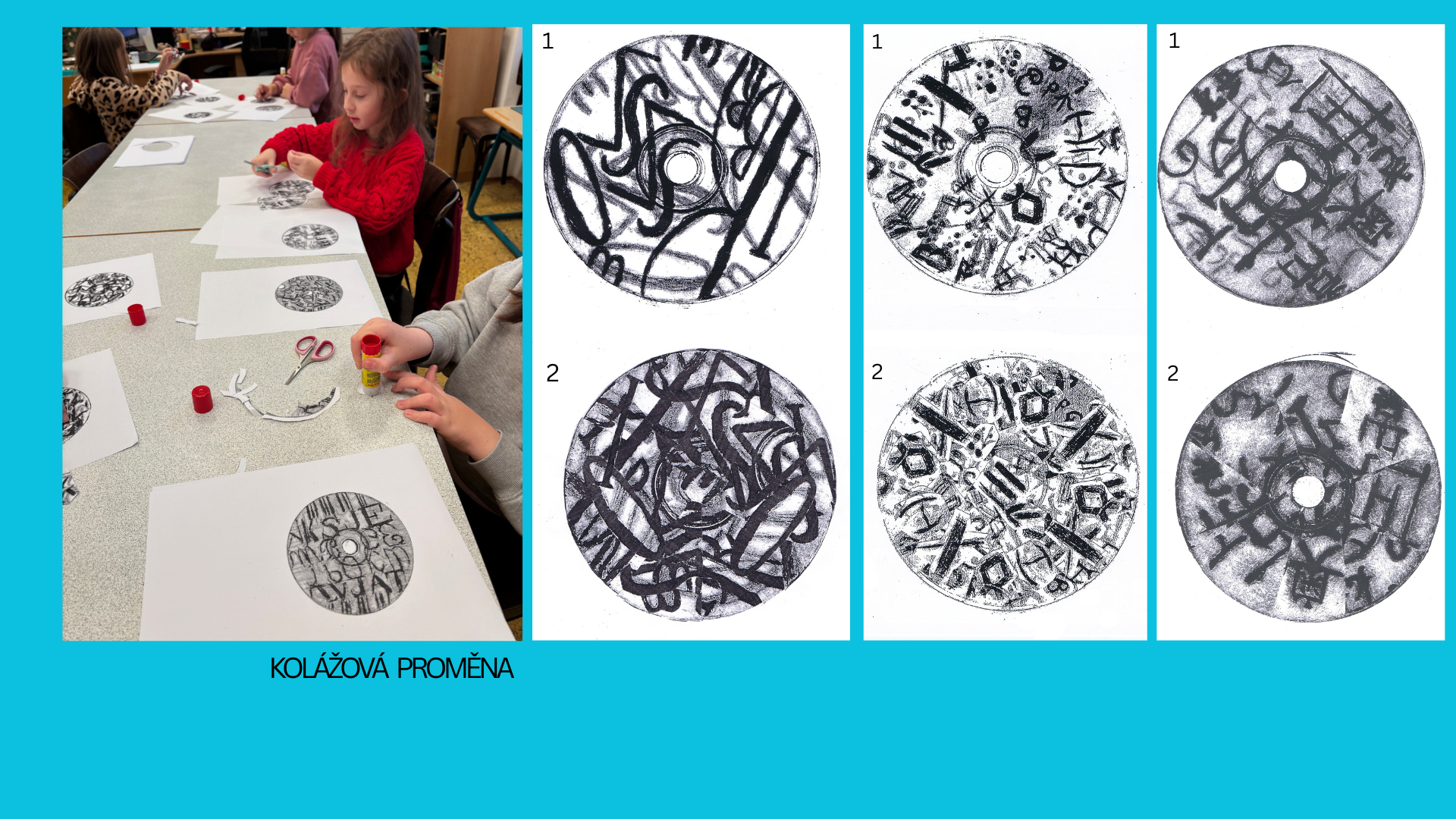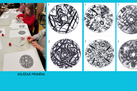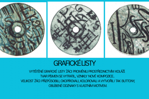 Proměna grafických listů prostřednictvím koláže měla podtrhnout hravost, omezit čitelnost, upozornit na osobitost tvůrce. Kolorování bylo další tvůrčí výzvou. Jak působí barevná harmonie, disharmonie, celková barevná kompozice. Od starých, nepoužívaných CD jsme došli k buttonům, které žáci hrdě nosí a rozdávají. Výsledek nebyl cílem, proces tvorby byl zásadní a obohacující.