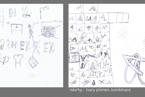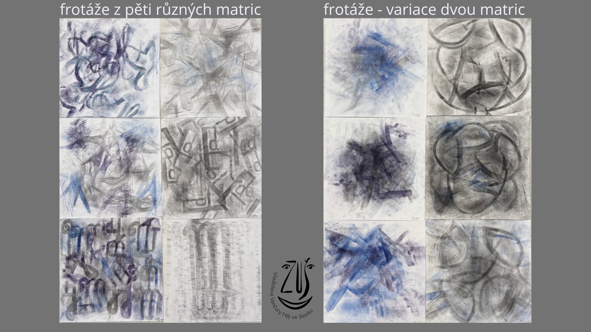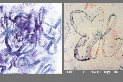 Monogram jsou zpravidla dvě hlásky, dvě písmena, která si nemůžeme vybrat. Jsou nám dány. Ale tvar těchto písmen, jejich spojení či propojení, to už je výtvarný úkol. Šablona vznikla pro následné frotážování. Zajímavý byl proces seznamování se s různými tvary písma, jejich tvůci a současným vývojem/ dokument GRAFICKÝ DESIGN/. Následovalo navrhování a hledání nejvhodnější varianty pro tvorbu matrice. Výslednou frotáž ovlivnil tvar a velikost zvolených písmen a také dynamika frotážování. Frotáže vypovídají o chrakteru žáka nebo o jeho momentálním rozpoložení či náladě, jsou něžné, důrazné, hravé, chaotické, s řádem,.... Tak vznikly různé varianty v konkrétnější či abstraktní poloze. Nad vzniklými čtverci žáci vzájemně diskutovali, seskupovali je, vnímali jejich rytmus, charakter, dynamiku, a také osobnost tvůrce.