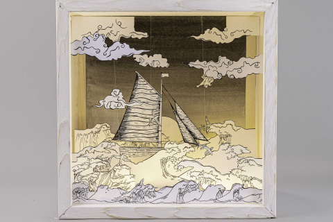 1ks odkaz na video smyčku (you tube) obsahující formou fotosnímků záznam realizovaných světelných objektů a 2ks černého kartonu formátu B 70x100cm se zapaspartovanými grafikami čtvercového formátu jako doprovodné ilustrace vzniklé v rámci projektu