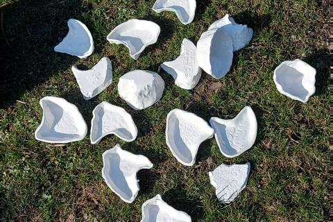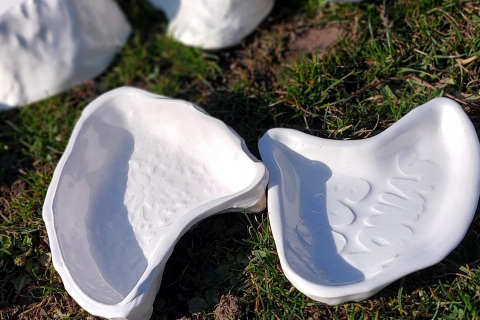 Porcelánové misky a talířky, jejichž dna mají tvar přesného obrysu Svinova, části Ostravy, kde je naše škola.