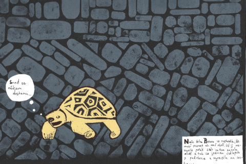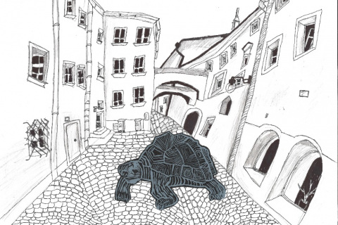 Je umístěná přímo na dlažbě, takže máte pocit, že by se mohla dát do pohybu. Zkusili jsme ji proto oživit a poslat na výlet po okolí. Zpracovali jsme příběh o želvě, která se toulá Olomoucí, jezdí tramvají, a nakonec zamíří za ostatními zvířaty do ZOO na Sv. Kopečku.