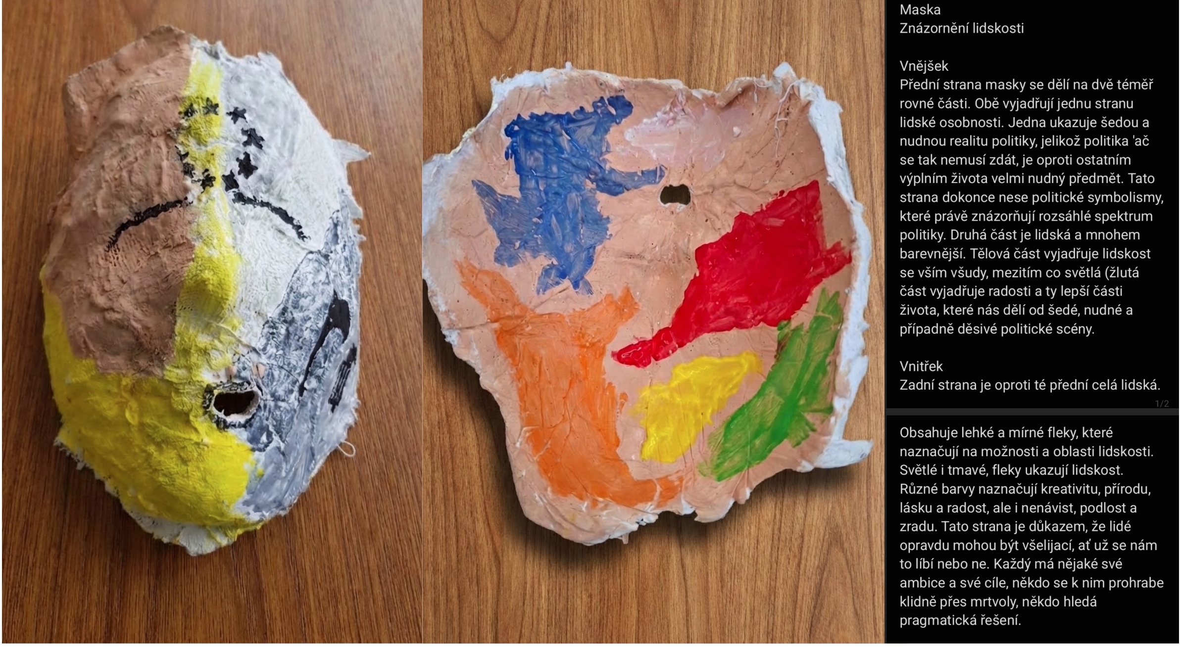 Hlavním těžištěm projektu je práce s vnitřní částí masky, která v tradičním pojetí zůstává skrytá; zde se však stává nositelem intimního potenciálu a soukromého sdělení. Zatímco vnějšek komunikuje směrem ven k divákovi, vnitřní strana otevírá prostor pro dialog, který je určen výhradně nositeli a může zůstat pro okolí neviditelný. Právě v tomto napětí mezi veřejným krunýřem a skrytou podobou uvnitř se pohybuje smysl celé práce – v otázce, jakou podobu má komunikace, která není určena pro oči druhých. Doprovodné texty studentů pak tuto neviditelnou linii mezi vnějškem a vnitřkem pojmenovávají a odkrývají osobní vztah, který si ke své „druhé/skrývané tváři“ vytvořili.