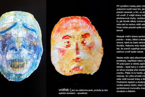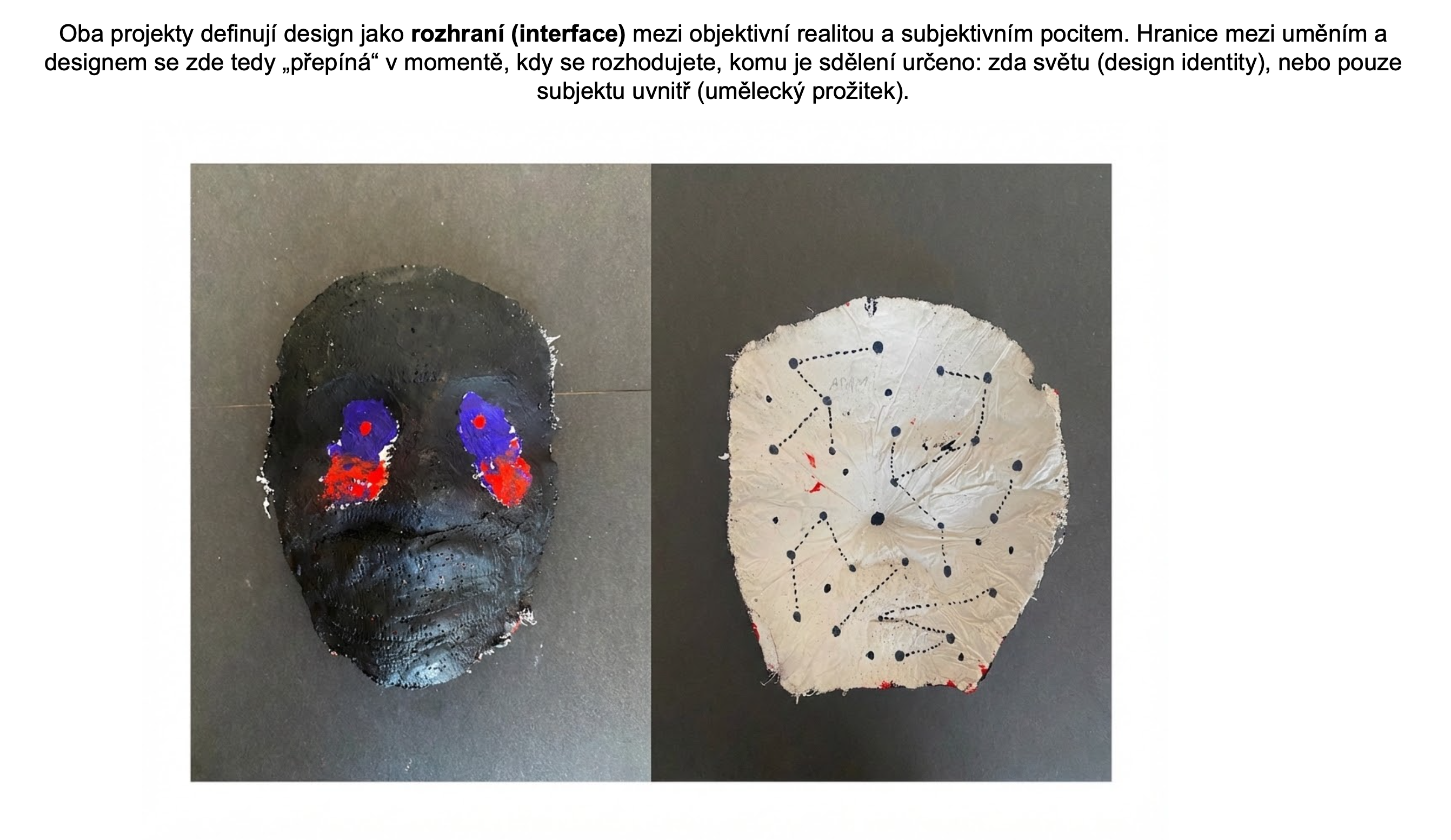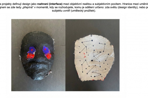 Projekt „Moje maska“ zkoumá hranici mezi vnějším projevem a vnitřním prožitkem skrze proces sádrového otisku tváře. Jedná se o poměrně běžné výtvarné zadání, které má svoje důležité místo ve výukách. V otázce hranic designu a umění je to však velmi nosné zadání. Maska nemusí být chápána jako rekvizita vázaná ke konkrétní tradici masopustu či karnevalu, ale jako univerzální archetyp – nástroj ochrany, prostředek spojení s duchovním světem nebo prostor pro vznik nového alter ega. Když maska postrádá pevnou kulturní dedikaci, tak se její design posouvá do roviny čistě uměleckého objektu, který si však stále uchovává svou původní účelovou formu „slupky“, jež překrývá lidskou tvář.