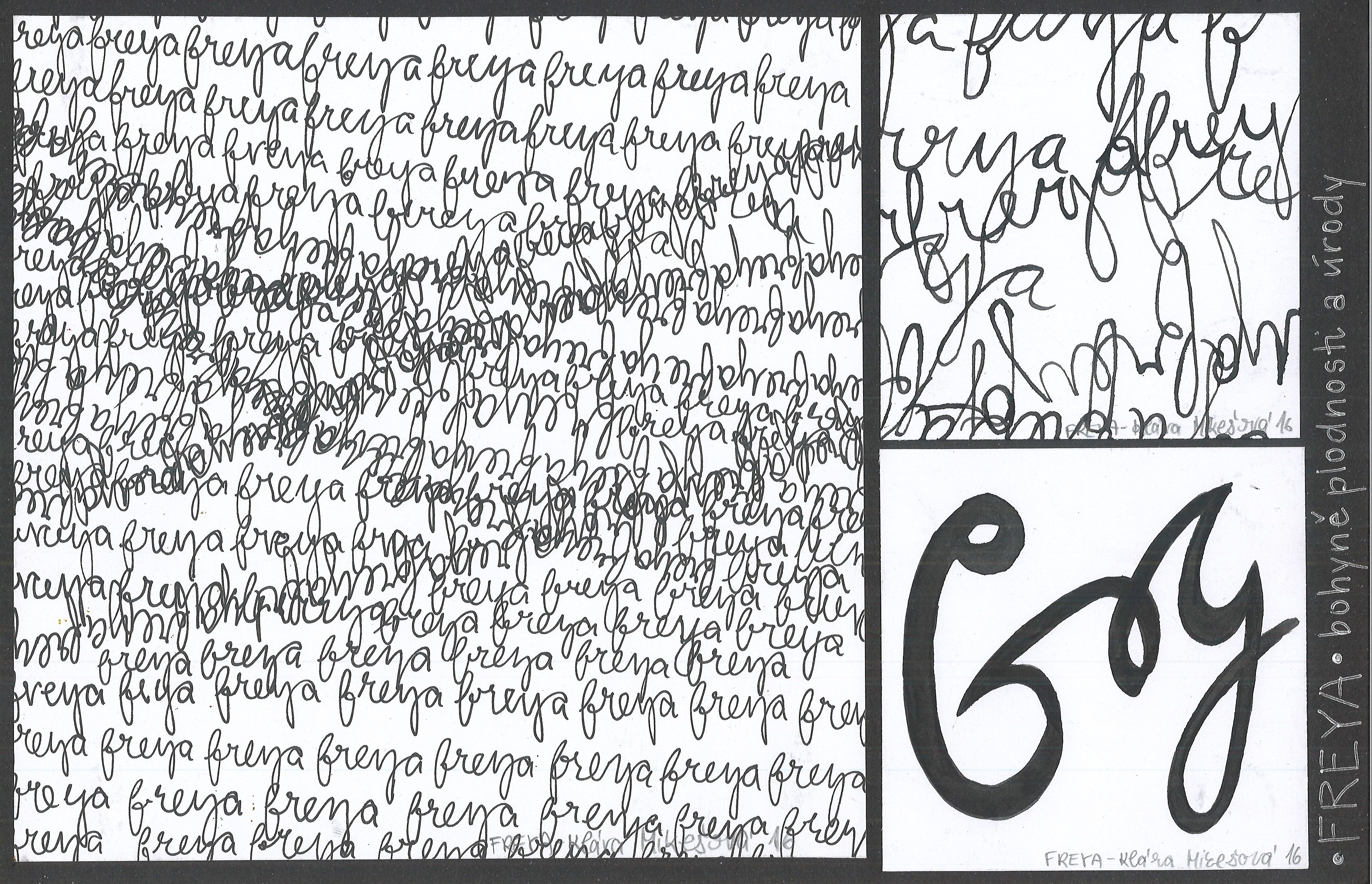 Severskou mytologii jsem vybrala proto, že její filmové zpracování je mezi studenty oblíbené a já jsem chtěla nabídnout ještě trochu jiný pohled na věc. Znak jména jsme tedy zkoumali na pozadí stylizovaných charakteristik severského pantheonu, kdy jsme se pokusili nejprve lineárním záznamem, posléze tvarem a jeho kompozicí v ploše vyjádřit „osobnost“ jednotlivých „božstev“. Dovětek pak patřil osobní identitě v návaznosti na vlastní jméno.