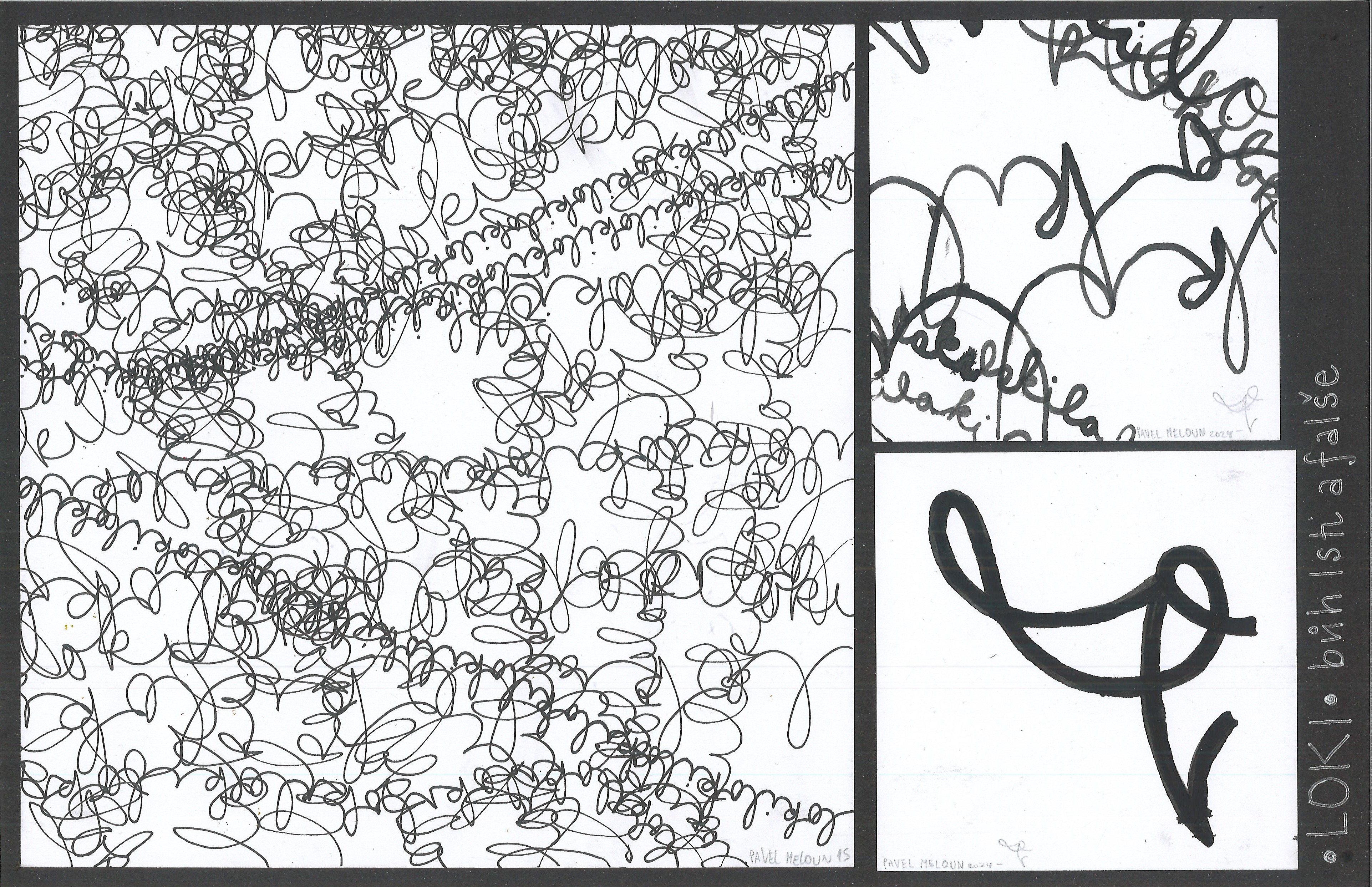 2. Vzývání, symbolické sžití s božstvem - grafický záznam jména – automatické psaní, zmnožení zápisu, práce s psaným písmem a jeho kompozicí na malé ploše,