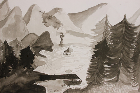 Na tuto zkušenost navazovalo studium čínské krajiny realizované tuší technikou lavírování. Žáci pracovali s linií jako nástrojem budování prostoru, rytmu a atmosféry obrazu a soustředili se na vztah linie a plochy i stylizaci přírodních motivů.