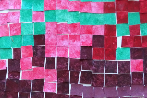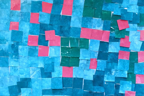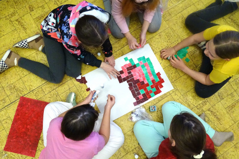 Žáci vychází z teorie barev. Spolu vyberou jednu barvu. Každý maluje na čtvrtku temperami jeden odstín této barvy (od nejsvětlejší po nejtmavší), ale jeden žák ze skupiny barvu "narušuje" a maluje barvou komplementární/kontrastní. Vystřihnou čtverce a házejí kostkou. Kolik hodí na kostce, tolik čtverců svého odstínu přidají do společné práce dle "piškvorkového schématu". Co je barva, která nemá žádný tvar? Žádné hranice? Stane se něco, když barvu vystřihneme?
