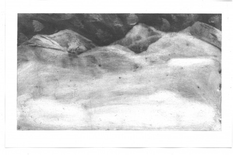 Další pokusy byly tisk krajiny ze smirkového papíru. Na smirkovém papíru jsme krajinu vytvářeli ve vrstvách lakem. Nebo tisk z šablony. Vytváření obrazu škrábáním do zaschlé tuše na skle nebo dobarvování tušových fleků v počítači a složení obrazu v grafickém programu. K tomu nás inspiroval skicák Dory Dutkové. Zjistili jsme taky, že princip tisk z plochy (litografii) si můžeme vysvětlit a zkusit, když naše matrice bude kopie naše