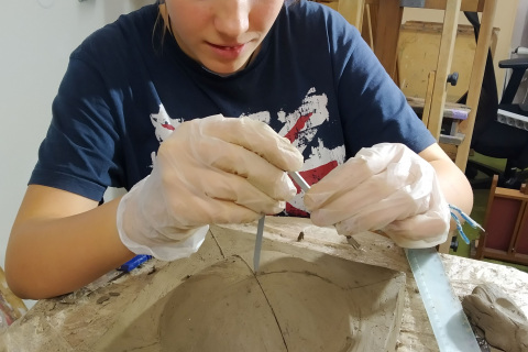 Ráchel se pro svou absolventskou práci inspirovala kultovním designem obkladů stěn pražského metra, které navrhl architekt, designér a výtvarník Jaroslav Otruba. Zaujala ji hlavně kombinace konkávních a konvexních tvarů známých jako „prso/antiprso“. Cíl, ke kterému se studentka propracovává, by měla být kompozice kolorovaných sádrových odlitků -prs/antiprs, které by mohly fungovat jako skládačka - něco jako poskládej si svá Prsa/Antiprsa. Práce je zatím v procesu tvorby. Oceňuji, že si Ráchel vybrala tak náročný sochařský projekt, něco, co ještě nikdy nedělala, vstoupila do neprobádaných, pro ni nových technologií a postupů. Absolvovaly jsme mnoho konzultací se sochaři, bylo třeba nemálo materiálových a technologických zkoušek, studovaly jsme videa s postupy odlévání a práce se silikonem. Kromě modelování prsa a antiprsa, si Ráchel vyzkoušela vytváření silikonové a sádrové formy, odlévání jednotlivých sádrových odlitků a jejich patinování. Z důvodu technologické náročnosti se nám nejspíše nepodaří na přehlídce ukázat celou finální práci a tak budeme prezentovat celý unikátní proces tvorby prostřednictvím portfolia.