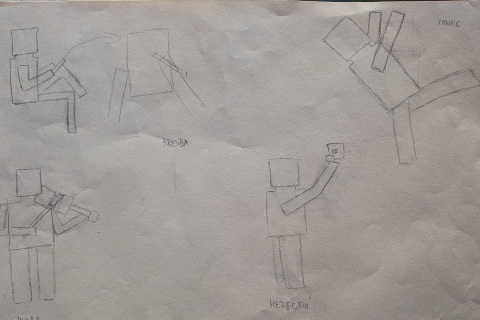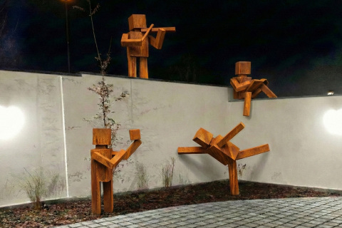 Nedávná rekonstrukce jedné z budov naší školy otevřela nový exteriérový prostor, který se stal inspirací pro vznik unikátní sochařské instalace. Autorkou celého konceptu je sedmnáctiletá žákyně Eliška Jüstelová, která se rozhodla toto místo oživit dílem reflektujícím samotnou podstatu uměleckého vzdělávání. Její návrh pracuje se čtveřicí postav, které reprezentují klíčové obory školy – hudebníka, tanečnici, výtvarníka a herce. Tyto figury nejsou statickými objekty, ale dynamicky využívají architekturu budovy a její zdi, čímž vytvářejí organické propojení mezi uměním a konkrétním prostorem školy.