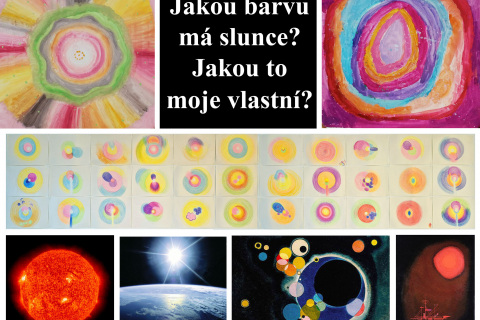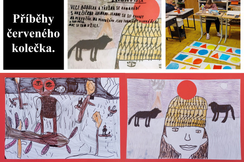 (Co pro děti nejčastěji symbolizuje červené kolečko? Mezi nejfrekventovanější metafory patří slunce, oči, světlo semaforu, klaunský nos či balónek. I když se motivy opakují, v konkrétním příběhovém rozvedení – kresbou i slovem – se stávají jedinečnými. Červené kolečko v knize funguje nejen jako společný motiv, ale také jako sjednocující grafický prvek. Tomuto zadání předcházel úkol inspirovaný V. Kandinským, při němž jsme společně zkoumali, zda mají tři základní barvy své odpovídající geometrické tvary a zda v nás vyvolávají podobné pocity.)
