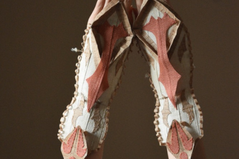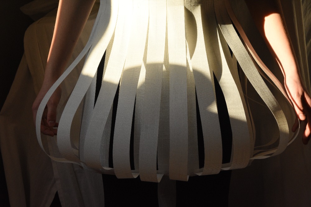 Takto se mi dostala pod ruce krabice s ořezy z textilních žaluzií. Tato impregnovaná textilní materie s výraznou texturou v omezené jednotné šířce se stala pro mě a mé žáky výzvou. Jak vytvořit, zkonstruovat z rovné plochy pruhu (pásky) trojrozměrný oděvní objekt!? Oděv, módní doplněk vyplynul z materiálu- textilu a z funkce žaluzií (zakrývání, ukrývání, oddělování, ochrany soukromí, vytváření světelné či klimatické atmosféry prostoru), což se obecně ztotožňuje s oděvem.