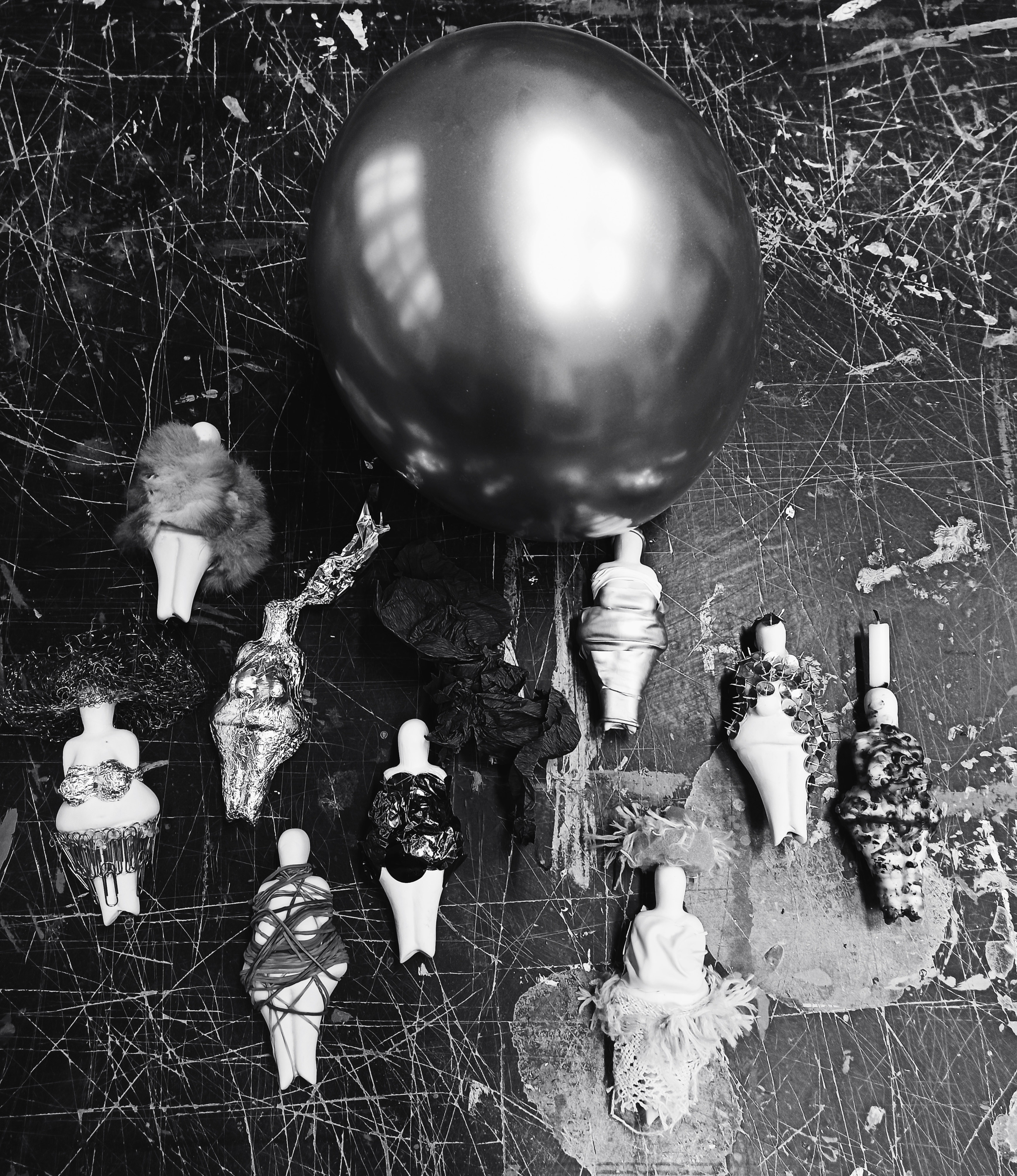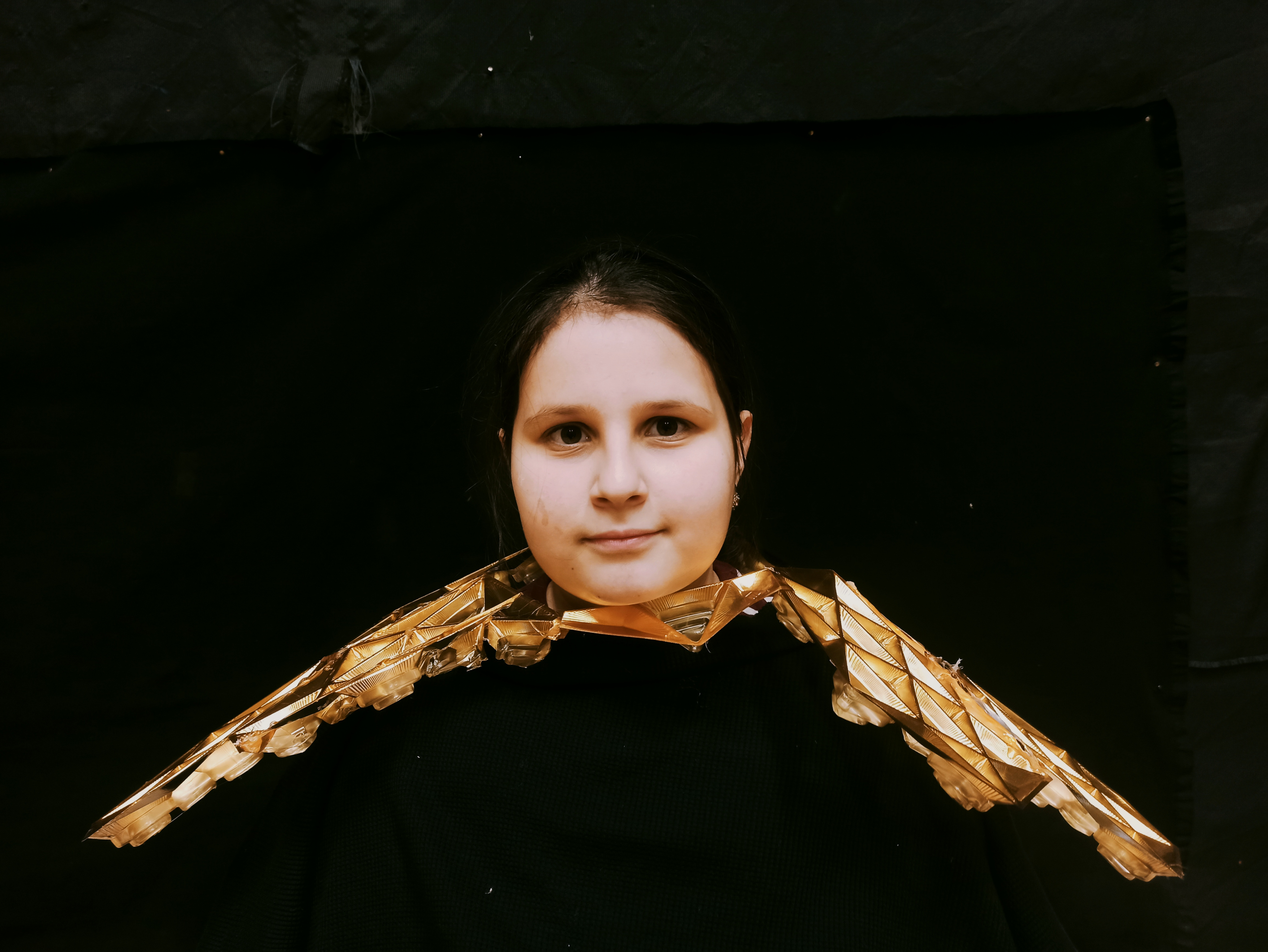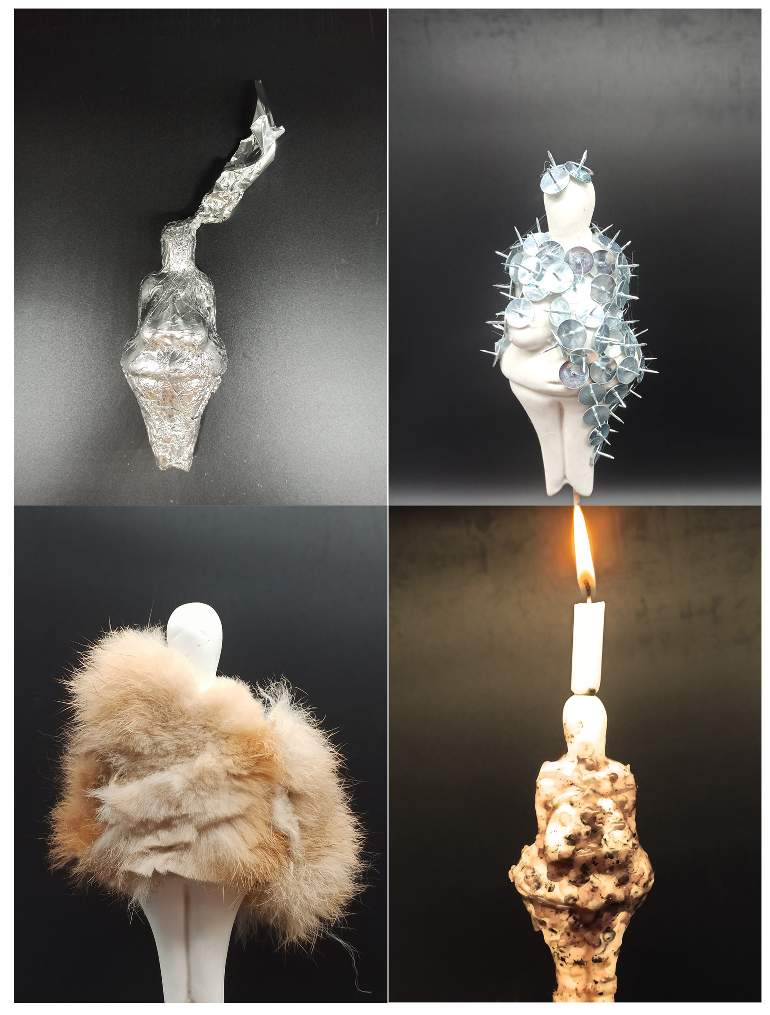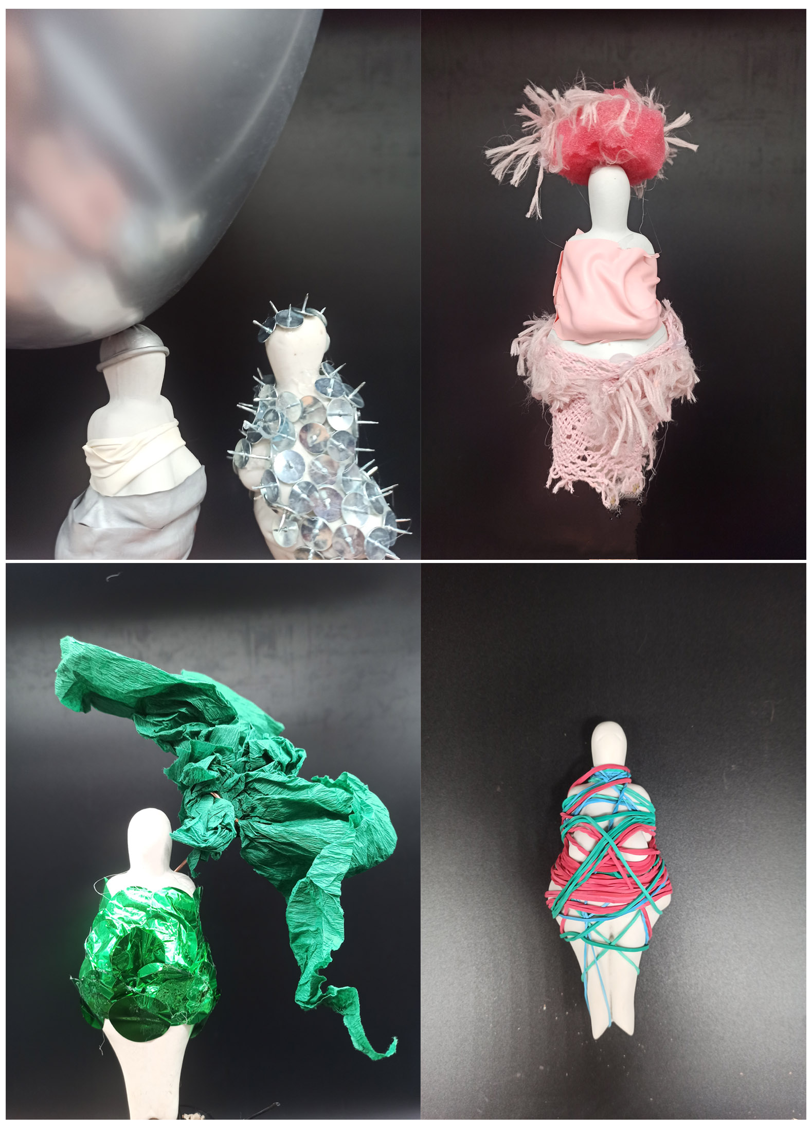 Pracujeme s odpadovým materiálem, který proměňujeme v novou formu. Hledáme hranici mezi oděvem a výtvarným objektem. Následuje práce s fotografií a vlastním tělem – tělo se stává sochou.