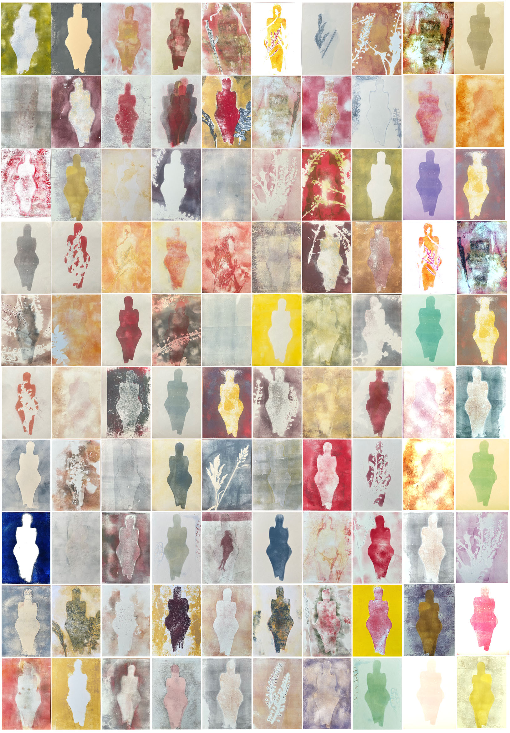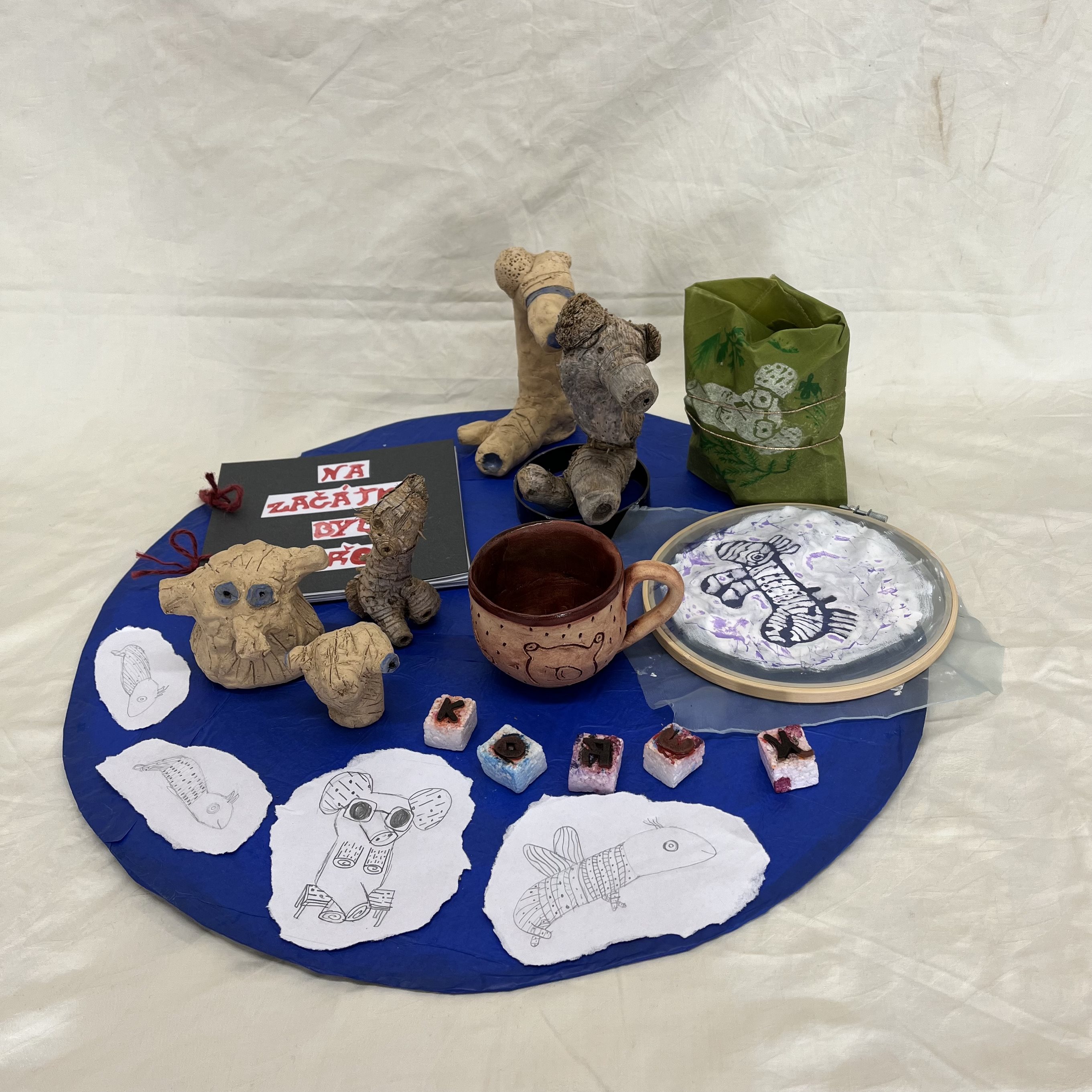 1x kniha, 2 kořeny rostliny, 1x portfolio, 4-5 keramických objektů, 1 sítotisk, 1 včelí ubrousek, 5 razítek písma, 4 malé doprovodné kresby