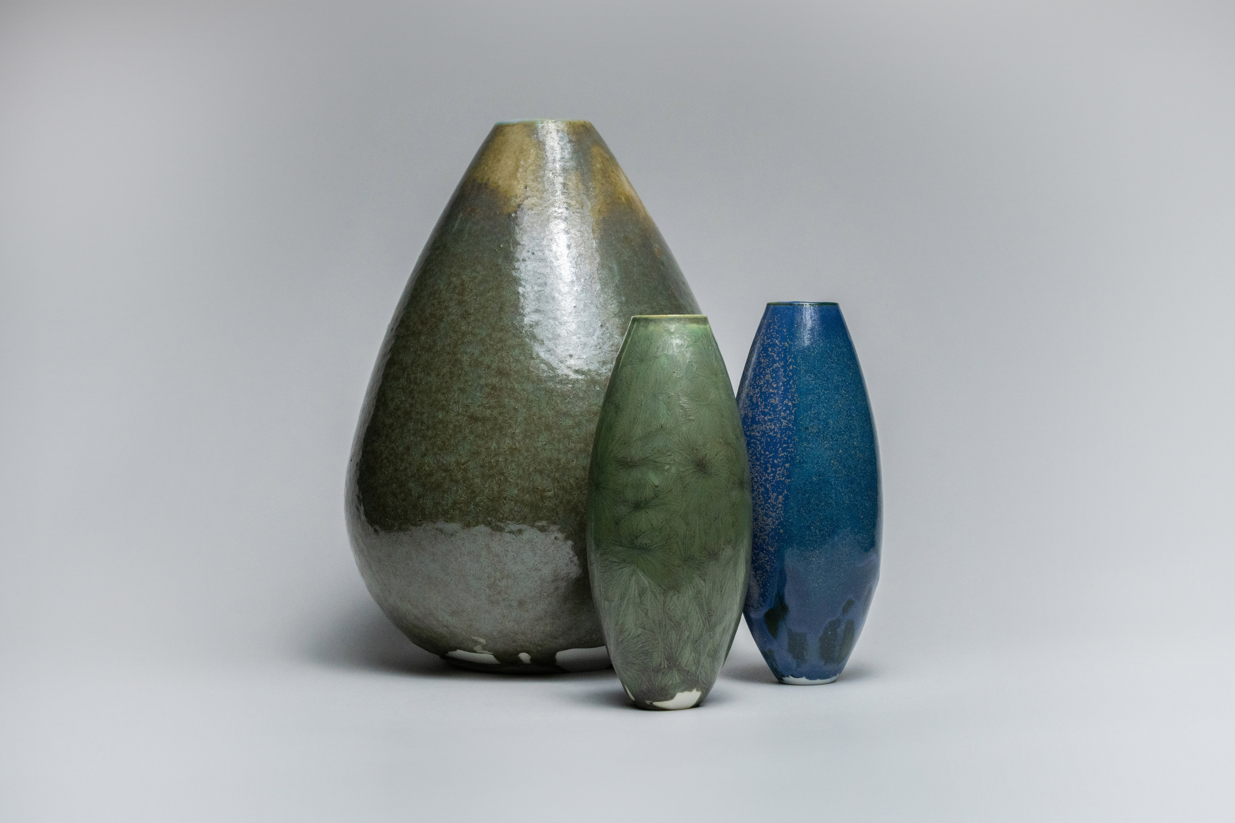 KOHOUT - 1x plastika, 40 x 20 x 50 cm, EXPERIMENTÁLNÍ VÁZY - vázy 3ks, 10 x 10 x 25cm, DOTEKY VODY - vázy 3ks, 10 x 10 x 25cm