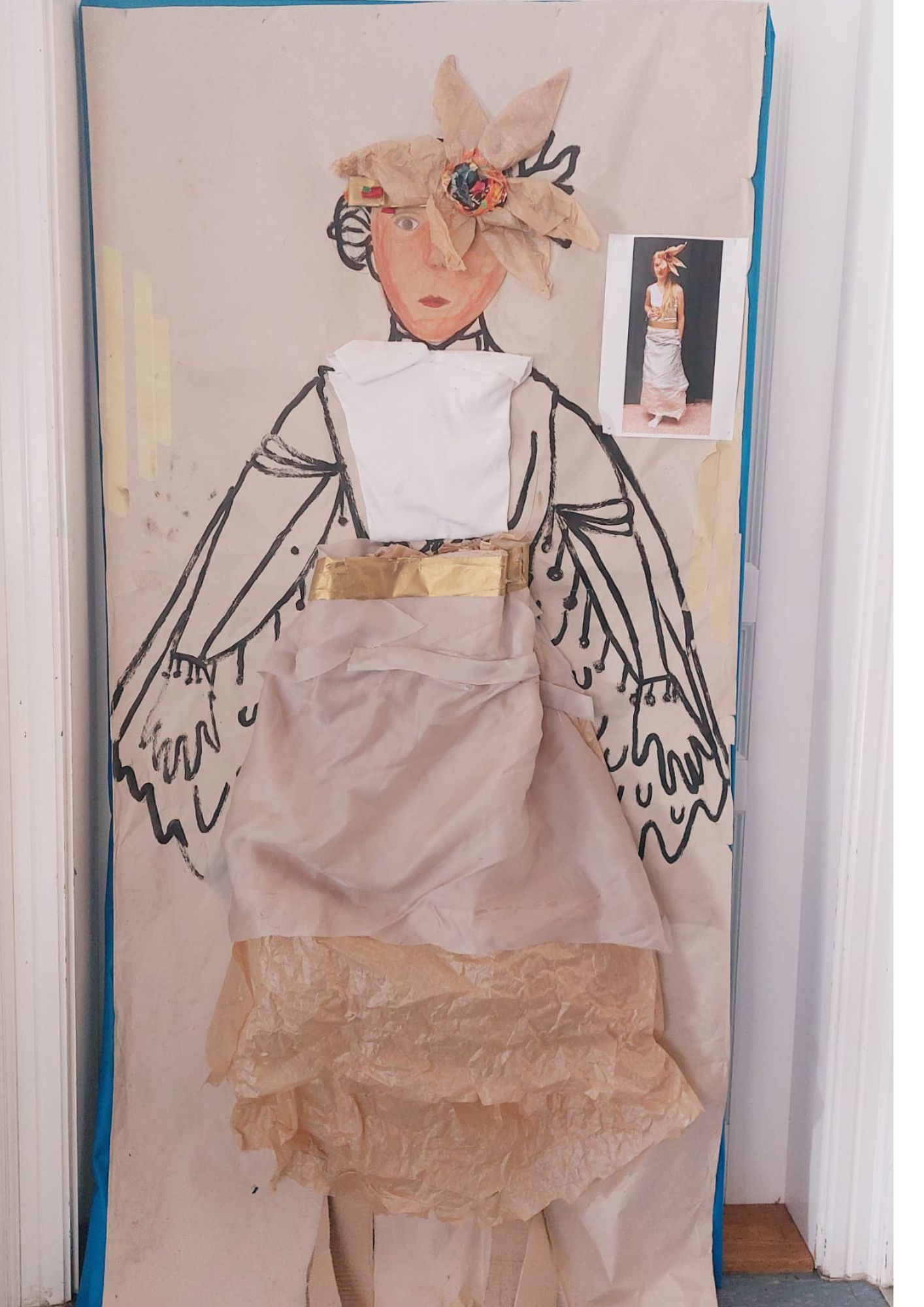 Pak na velký balicí papír jeden druhého obkreslili a štětcem a černou barvou zakreslili kostým i s detaily a doplňky, které by k němu měly patřit.
