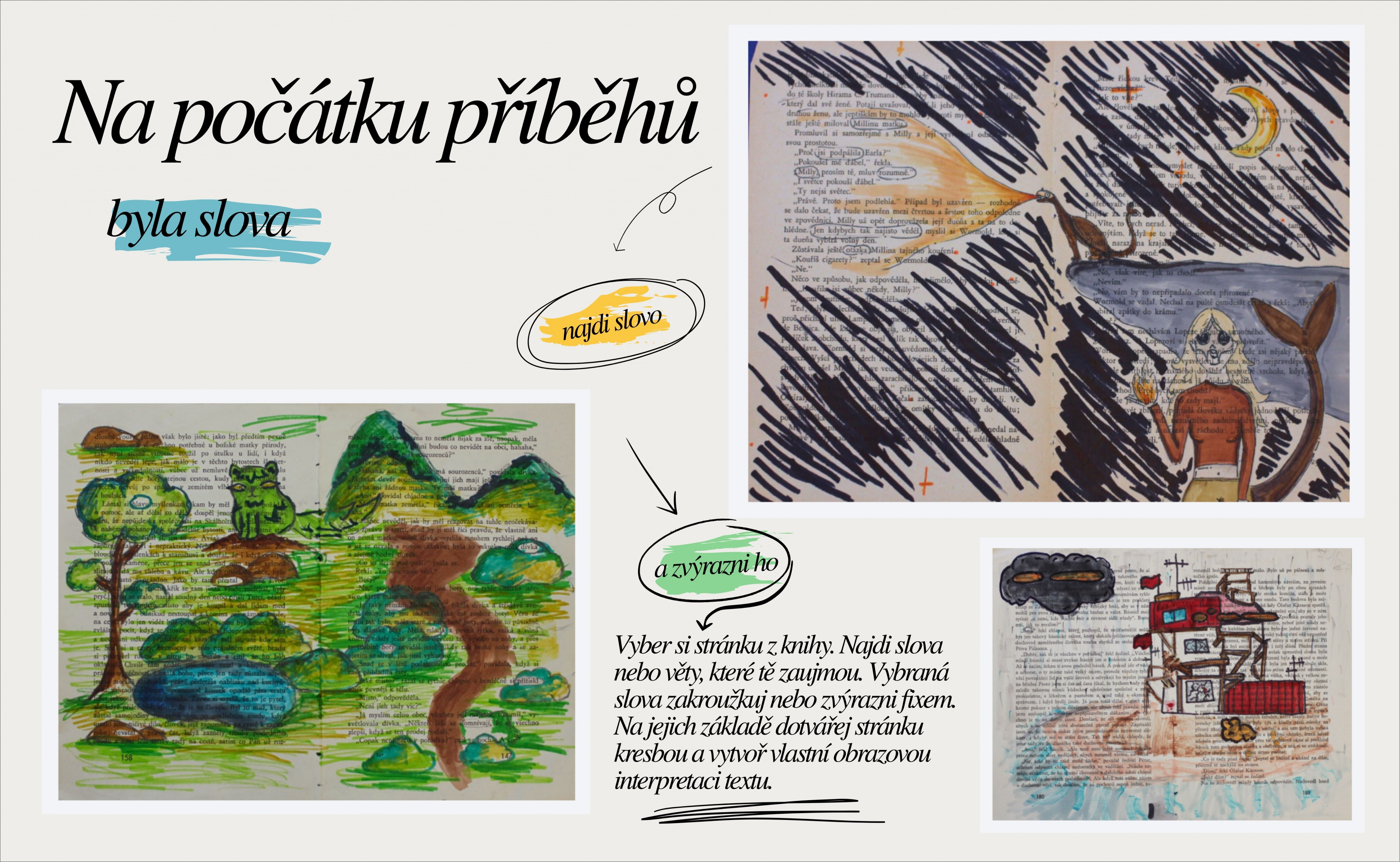Výchozím bodem byla obyčejná stránka z knihy. Žáci z textu vybírali slova a věty, které je zaujaly, a postupně je proměňovali v obraz. Původní text mizel pod kresbou a koláží a stával se zárodkem nového příběhu.