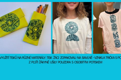 1x portfolio A4 2x triko s potiskem 2x pouzdro - plstěné 5x ukázky tisku na různý materiál, A4 1x A5 - rozvaha text 4x grafický list A5 4x koláž A4 buttony na plátně - k výstavě, buttony v krabičce na rozebrání