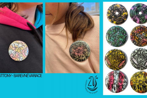 Proměna grafických listů prostřednictvím koláže měla podtrhnout hravost, omezit čitelnost, upozornit na osobitost tvůrce. Kolorování bylo další tvůrčí výzvou. Jak působí barevná harmonie, disharmonie, celková barevná kompozice. Od starých, nepoužívaných CD jsme došli k buttonům, které žáci hrdě nosí a rozdávají. Výsledek nebyl cílem, proces tvorby byl zásadní a obohacující.