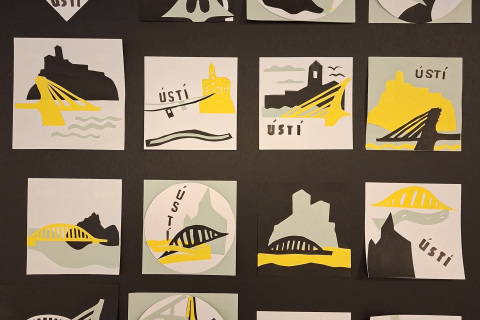 4x prostorová práce z kartonu, 9x malá logo města, brožura Jak jsme hledali logo Ústí