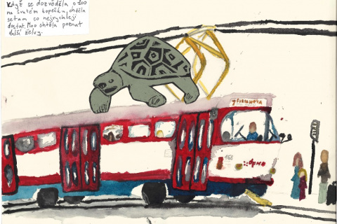 Je umístěná přímo na dlažbě, takže máte pocit, že by se mohla dát do pohybu. Zkusili jsme ji proto oživit a poslat na výlet po okolí. Zpracovali jsme příběh o želvě, která se toulá Olomoucí, jezdí tramvají, a nakonec zamíří za ostatními zvířaty do ZOO na Sv. Kopečku.