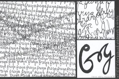 Severskou mytologii jsem vybrala proto, že její filmové zpracování je mezi studenty oblíbené a já jsem chtěla nabídnout ještě trochu jiný pohled na věc. Znak jména jsme tedy zkoumali na pozadí stylizovaných charakteristik severského pantheonu, kdy jsme se pokusili nejprve lineárním záznamem, posléze tvarem a jeho kompozicí v ploše vyjádřit „osobnost“ jednotlivých „božstev“. Dovětek pak patřil osobní identitě v návaznosti na vlastní jméno.