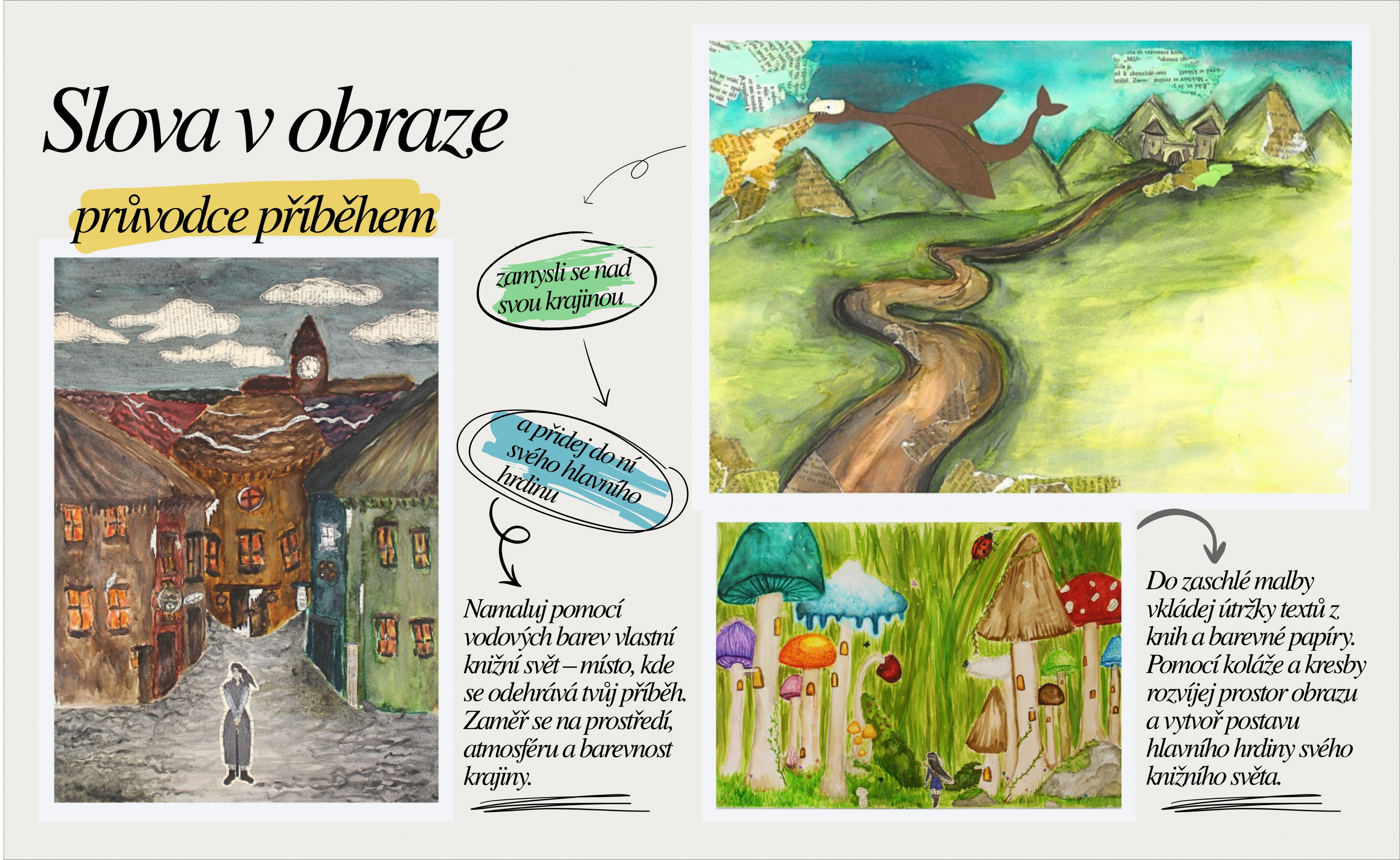 Výchozím bodem byla obyčejná stránka z knihy. Žáci z textu vybírali slova a věty, které je zaujaly, a postupně je proměňovali v obraz. Původní text mizel pod kresbou a koláží a stával se zárodkem nového příběhu.