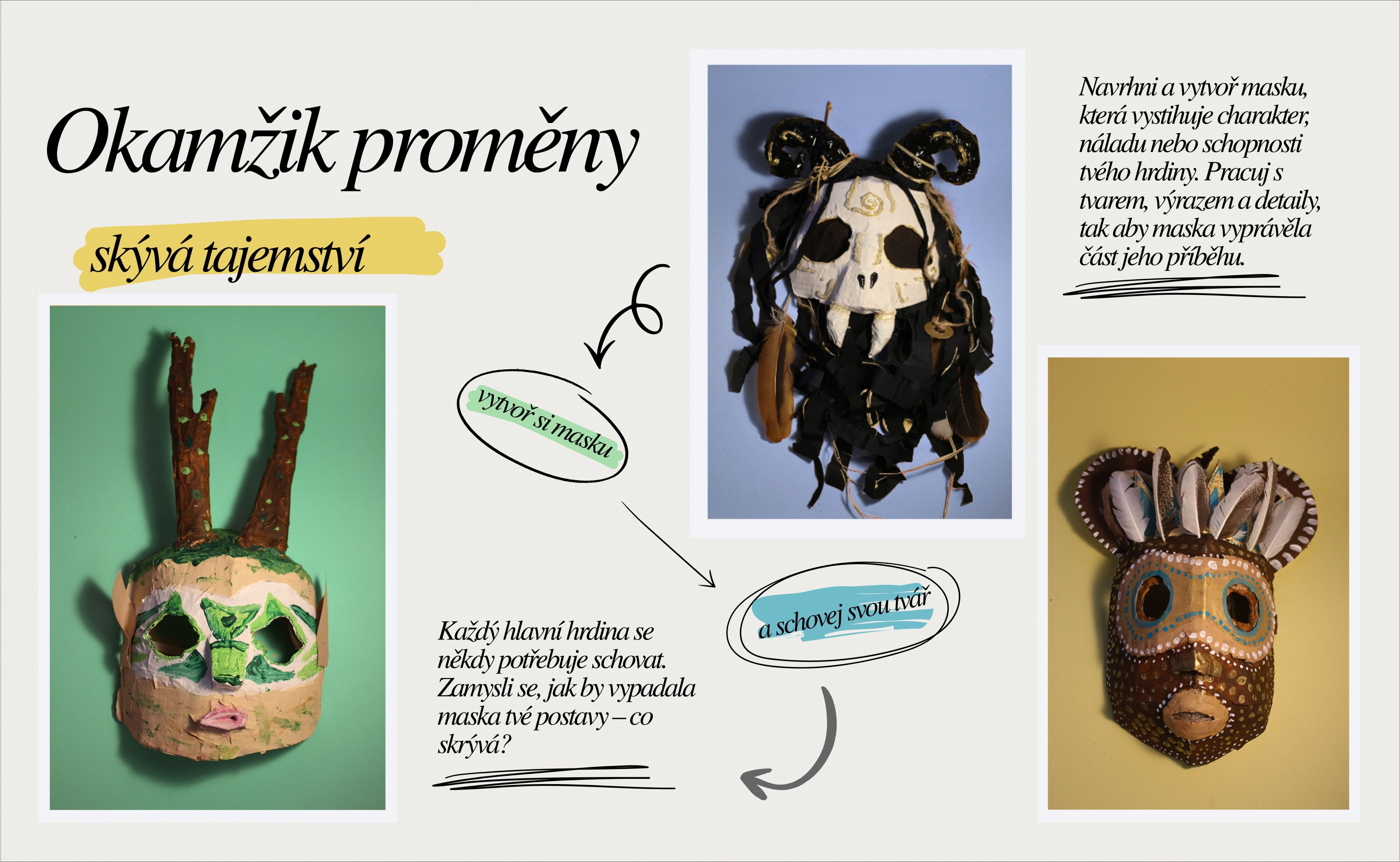 Postupně začal vznikat celý knižní svět. Hlavní postava získala keramickou podobu i masku a své prostředí, které žáci vytvářeli jako malé trojrozměrné dioráma v krabici z různých materiálů.