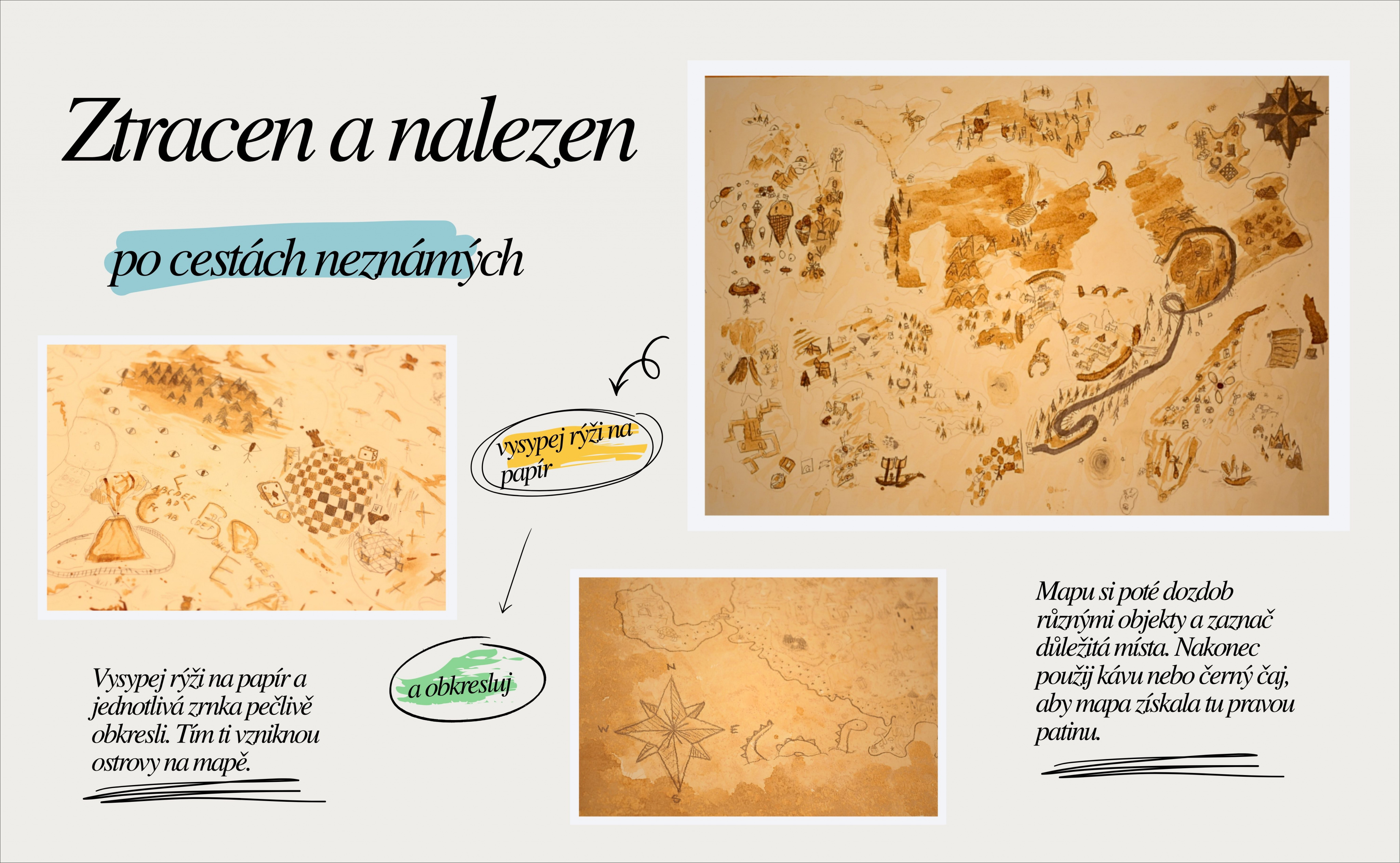 Součástí světa se stala také mapa. Ta vznikala experimentem s rýží či solí, jejichž obkreslováním se rodily ostrovy a krajiny. Mapy byly kolorovány černým čajem nebo kávou, aby získaly patinu starého dokumentu.