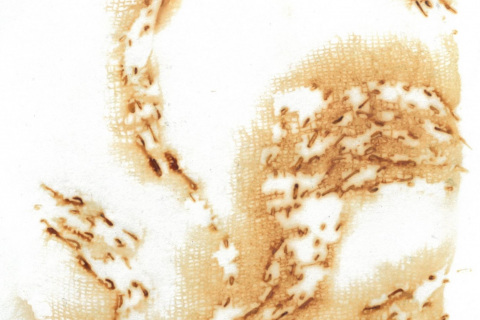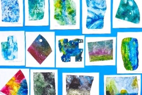 Další pokusy byly tisk krajiny ze smirkového papíru. Na smirkovém papíru jsme krajinu vytvářeli ve vrstvách lakem. Nebo tisk z šablony. Vytváření obrazu škrábáním do zaschlé tuše na skle nebo dobarvování tušových fleků v počítači a složení obrazu v grafickém programu. K tomu nás inspiroval skicák Dory Dutkové. Zjistili jsme taky, že princip tisk z plochy (litografii) si můžeme vysvětlit a zkusit, když naše matrice bude kopie naše