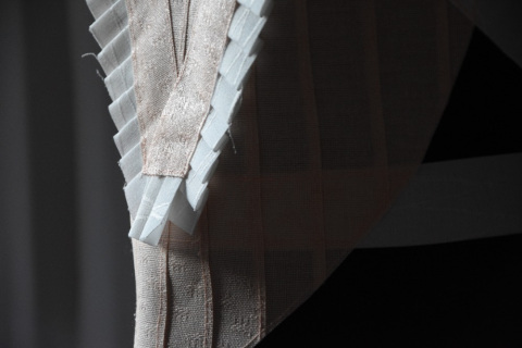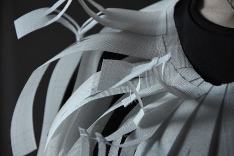 Takto se mi dostala pod ruce krabice s ořezy z textilních žaluzií. Tato impregnovaná textilní materie s výraznou texturou v omezené jednotné šířce se stala pro mě a mé žáky výzvou. Jak vytvořit, zkonstruovat z rovné plochy pruhu (pásky) trojrozměrný oděvní objekt!? Oděv, módní doplněk vyplynul z materiálu- textilu a z funkce žaluzií (zakrývání, ukrývání, oddělování, ochrany soukromí, vytváření světelné či klimatické atmosféry prostoru), což se obecně ztotožňuje s oděvem.